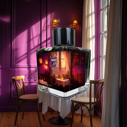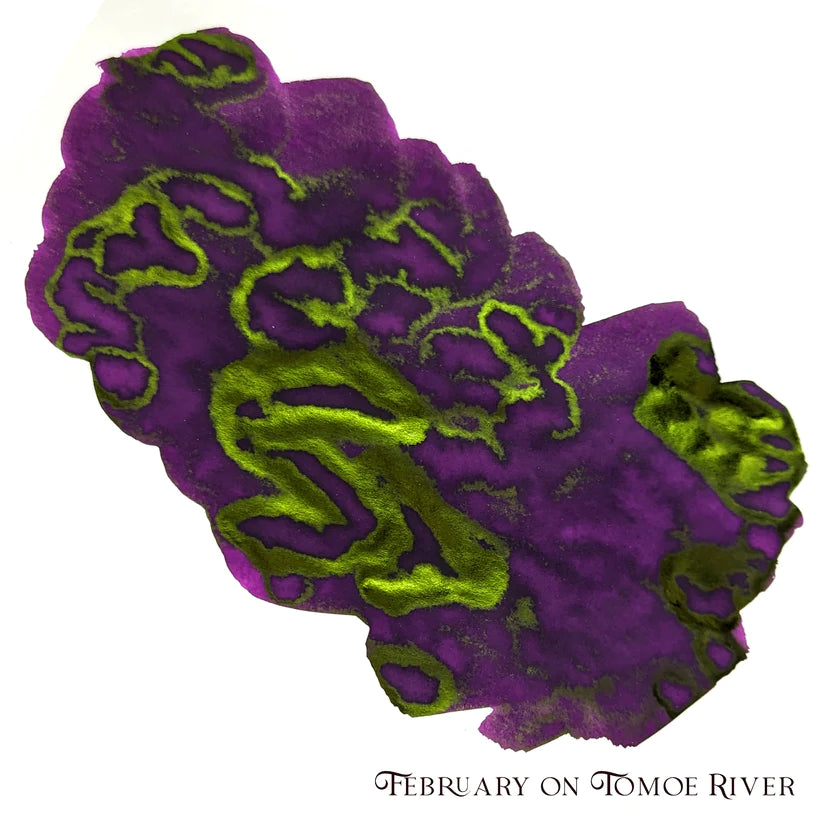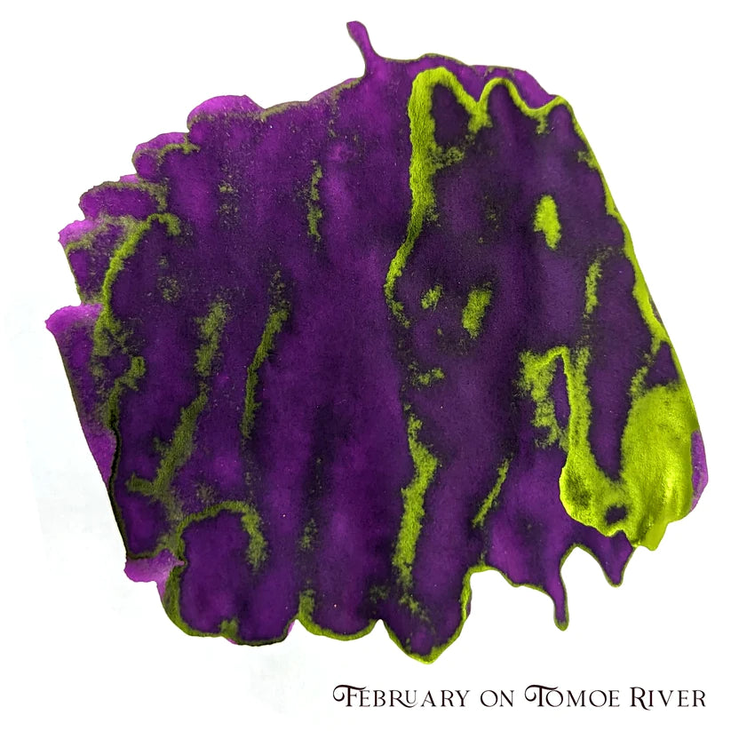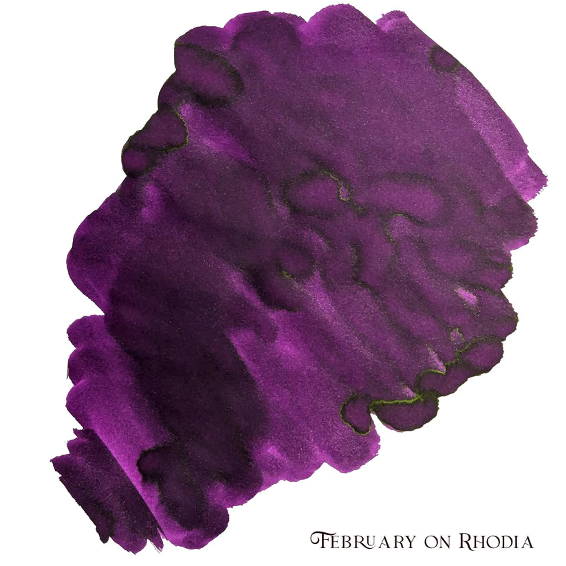 This luxurious grape purple hue exudes richness and warmth, evoking a sense of coziness and romance perfect for February. Enhanced with a delicate greeny-gold sheen, it dazzles on Tomoe River paper, while imparting a subtle and elegant shimmer on Rhodia, adding an extra touch of allure to your writing experience.