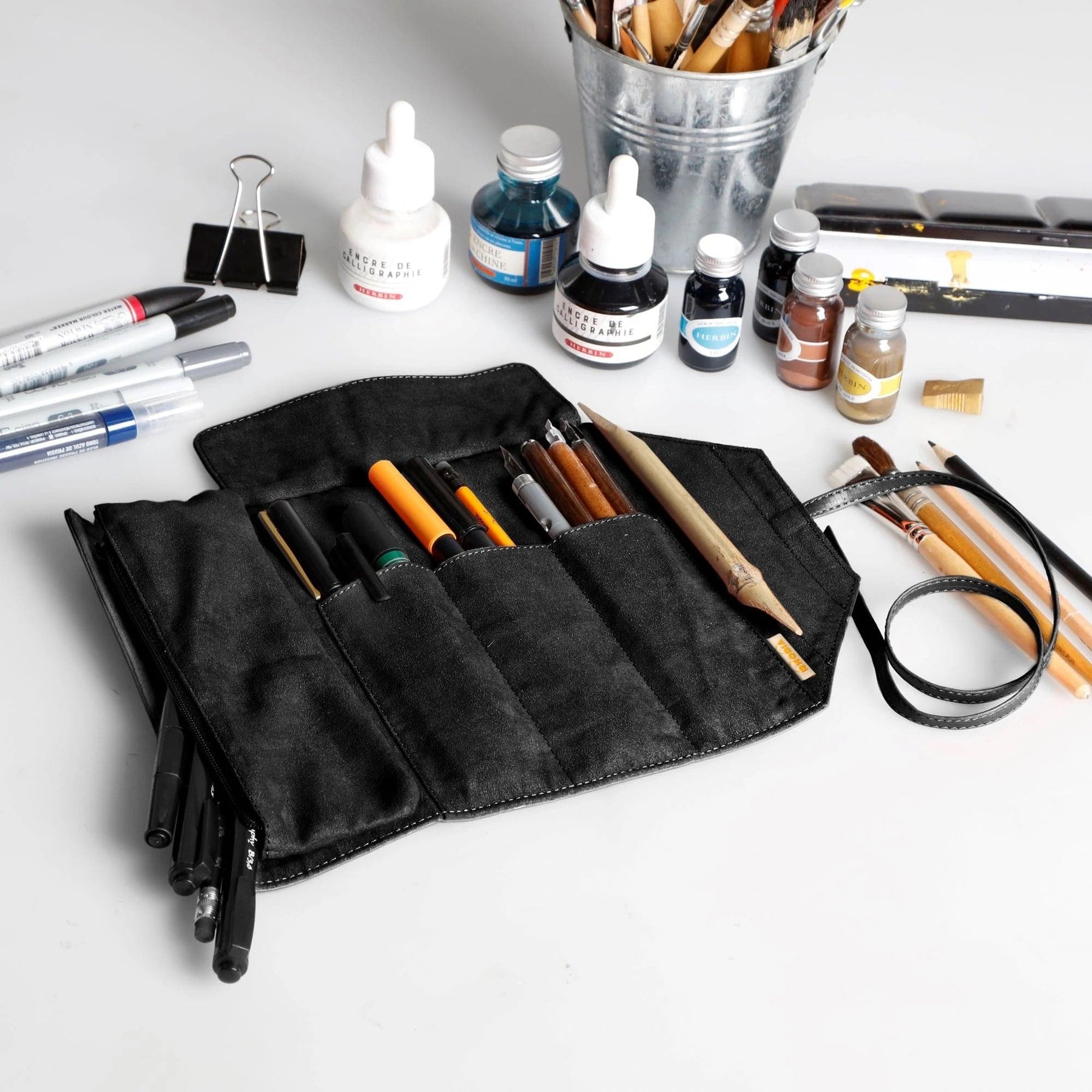This Touch 2 in 1 Sleeve Roll from Rhodia has been designed to store all of your pencils, pens, essential tools and more. This Italian leatherette sleeve roll features a compartmentalized tool pocket with protection flap, leatherette strap closure and a removable flat case with hook and loop fasteners. When you’re finished simply slide your items back into place, roll them up, tie it shut and you’re ready to go.