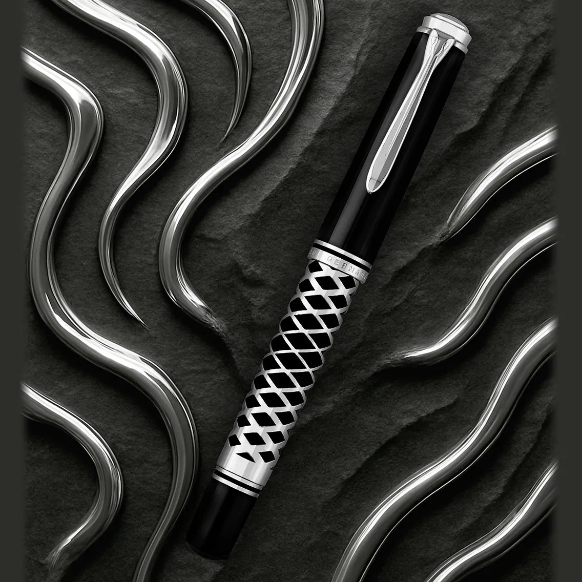 At the heart of this special edition lies a polished black acrylic barrel, encased in a laser-cut silver metal sleeve. The geometric rhombi pattern—sculpted with architectural accuracy—creates a powerful contrast between smooth resin and intricately cut metal. The result is bold, contemporary, and unmistakably Pelikan.